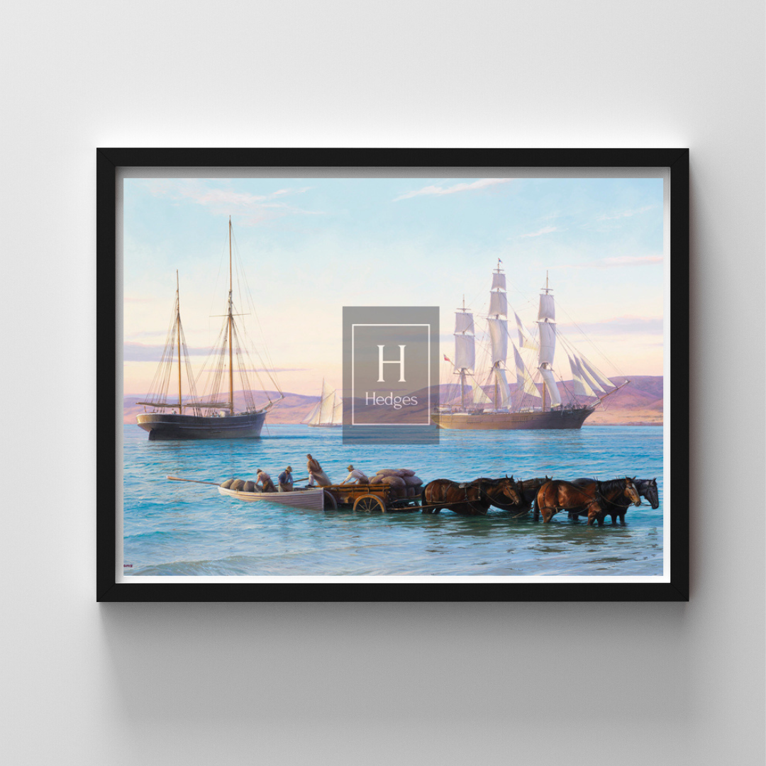 The artist's attention to detail is evident in the delicate brushstrokes used to render the play of light and shadow on the water's surface. The calm and stillness of the gulf are beautifully conveyed, creating a sense of serenity and tranquility. The reflection of the sky and distant clouds on the water adds depth and a touch of ethereal beauty to the composition. Overall, "Sunrise, Spencer Gulf" is a captivating artwork that invites viewers to immerse themselves in the serene beauty of nature. John Steven Dews brings to life the enchanting ambiance of an early morning sunrise over the Spencer Gulf, showcasing his talent as a maritime artist.