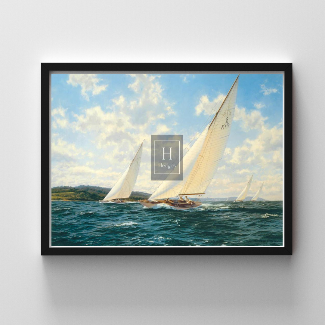 This particular artwork showcases Dews' ability to bring life to the canvas, depicting a thrilling moment of competitive yacht racing. The painting captures the essence of the race, with the yachts maneuvering through the water with great skill and precision, surrounded by the picturesque backdrop of the West Solent.