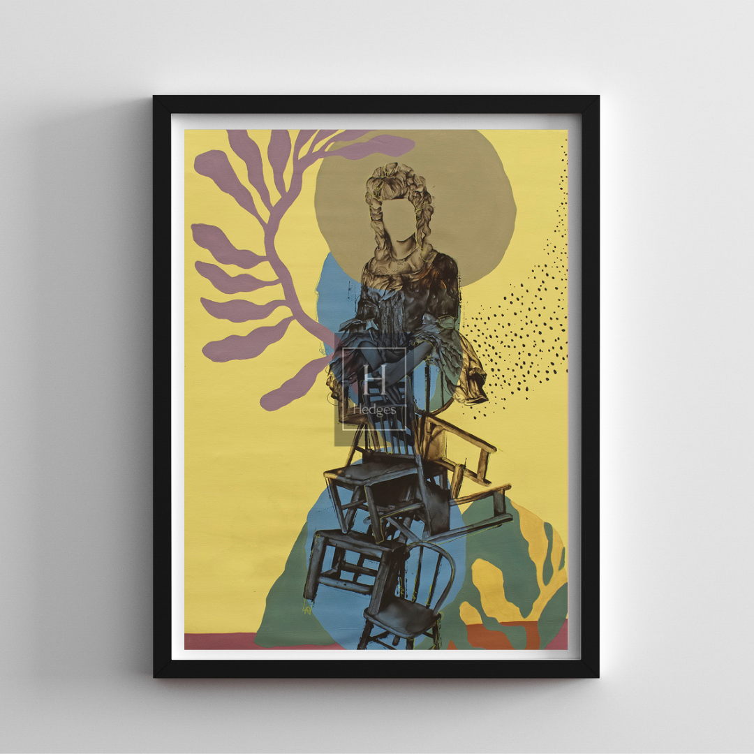 The noble figure perched atop unsteady, falling chairs embodies complex societal ideas about class and wealth. It also toys with the concept of a house of cards, reflecting the hidden workings of life and the undercurrents of chaos concealed beneath a serene facade. The artwork masterfully balances feelings of equilibrium, serenity, and composure with those of tension, uncertainty, and chance.