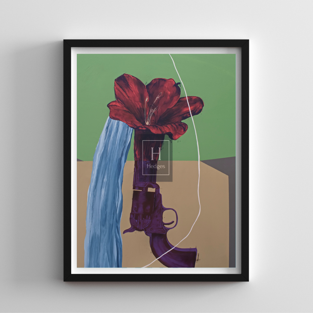 Within this piece, the juxtaposition of a gun and a flower engages with themes of peace, growth, and history. The image of a flower emerging from an aged firearm symbolises the transformation of the gun, which now serves no purpose other than as a vase, a relic of the past overtaken by blooming flowers and water. This surreal still life challenges the inherent nature of a gun, revealing the dominance of nature's overgrowth.